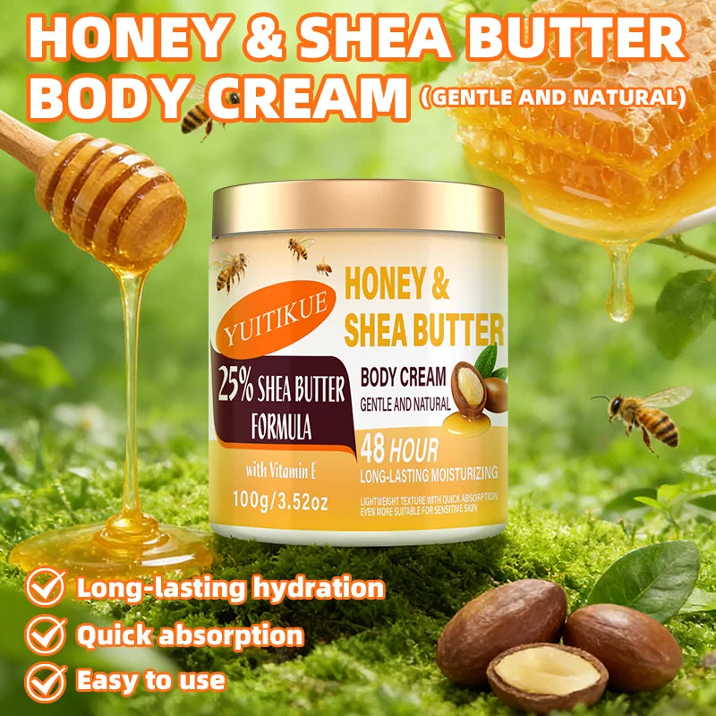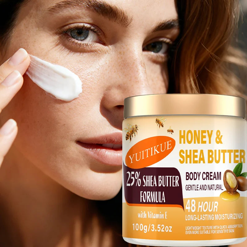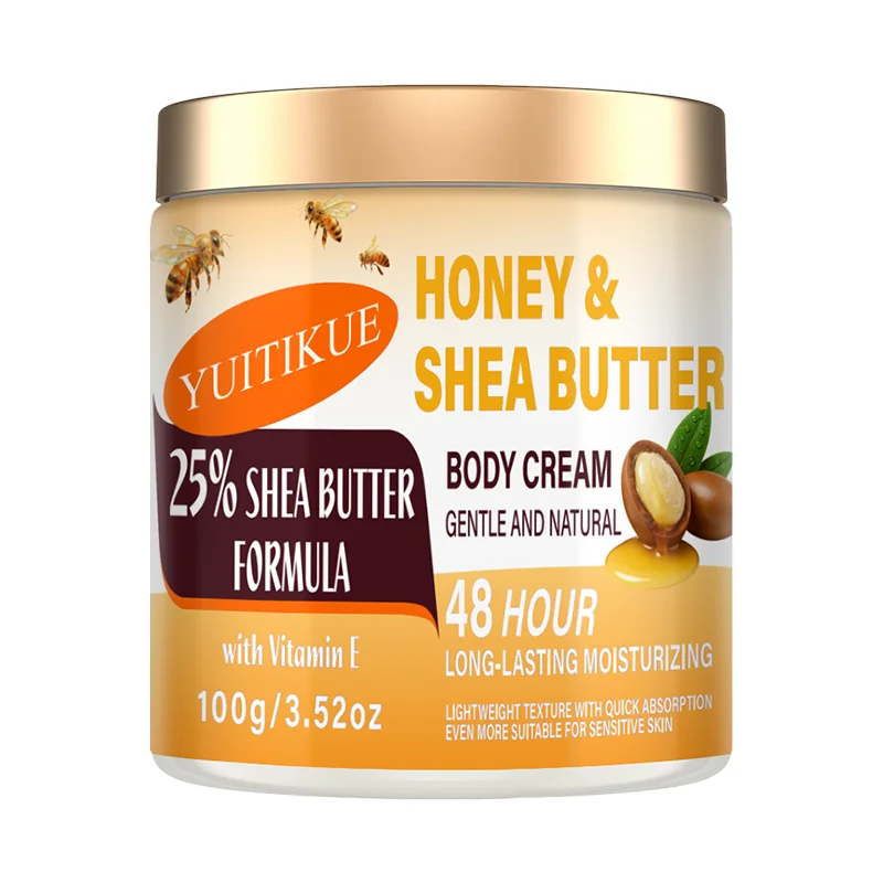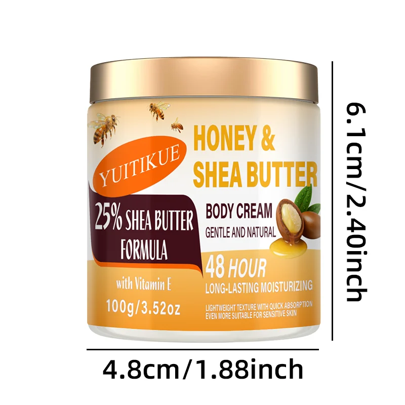 YUITIKUE Crème pour le corps au beurre de karité 25% 100g - 48H Hydratant pour le visage, le corps, les mains et les pieds, miel et vitamine E, soin tout-en-un